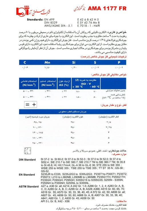 الکترود 1177FR محصول شرکت آما، یک الکترود قلیایی با استاندارد E 7018–1–H4R است که برای جوشکاری فولادهای تا 0.6 درصد کربن مناسب میباشد.