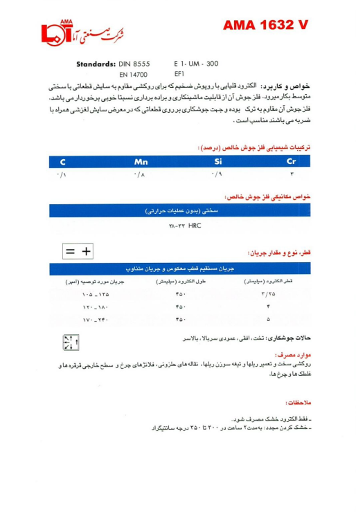 ✅ الکترود جوشکاری آما 1632V یکی از الکترودهای پیشرفته برای جوشکاری فولادهای مقاوم به حرارت، سایش و فشار بالا است. این الکترود به دلیل ویژگیهای فنی عالی، در صنایع نفت، گاز، پتروشیمی، نیروگاهها و صنایع فلزی سنگین به طور گستردهای مورد استفاده قرار میگیرد.