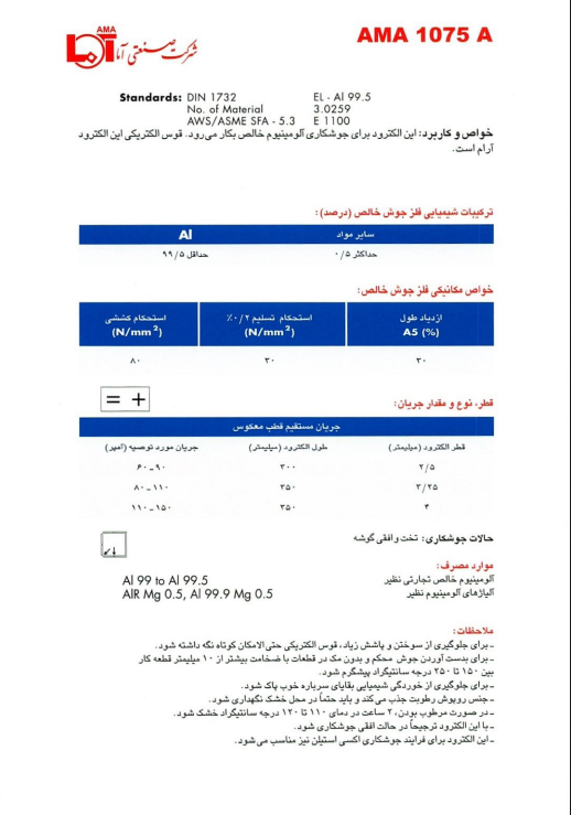 ویژگیهای الکترود آما 1075A: