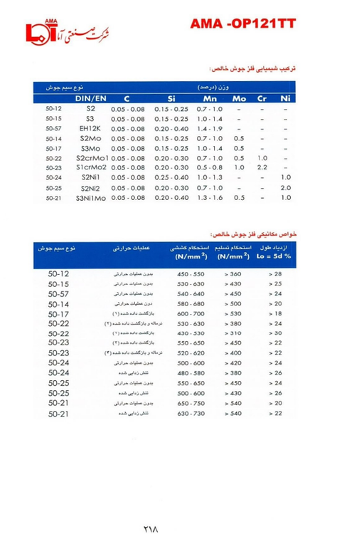 | نوع سیم جوش | عملیات حرارت | استحكام كششی (N/mm 2 ) | استحكام تسليم (N/mm 2 ) | ازدياد طول Lo=5d% |