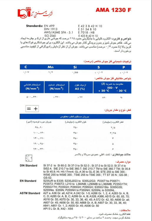 ویژگیهای فنی الکترود آما 1230F: