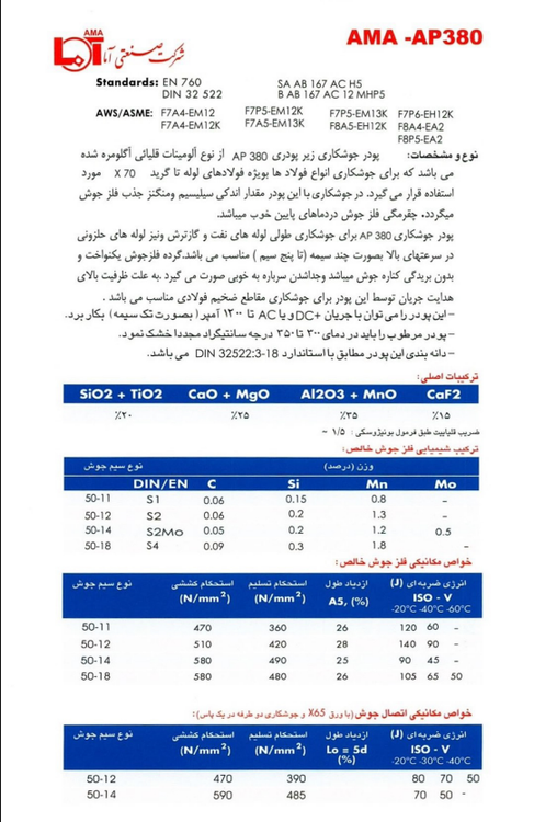 پودر جوشكاري زيرپودري AP380 از نوع آلومينات قليايي آگلومره شدهميباشد كه براي جوشكاري انواع فولادها به ويژه فولادهاي لوله تا گريد X70 مورد استفاده قرار ميگيرد. در جوشكاري با اين پودر مقدار اندكي سيليسيم و منگنز جذب فلز جوش ميگردد. چقرمگي فلز جوش در دماهاي پايين خوب ميباشد.