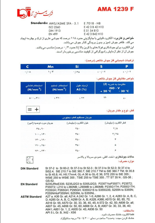 الکترود آما 1239F یک الکترود قلیایی با هیدروژن بسیار کم است که برای جوشکاری فولادهای کربنی تا ۰٫۴٪ کربن مورد استفاده قرار میگیرد. این الکترود به دلیل میزان هیدروژن پایین، مقاومت بالایی در برابر ترک داشته و چقرمگی مناسبی ارائه میدهد. همچنین، ظاهر جوش تمیز و بدون بریدگی کنار جوش بوده و از نظر آزمایش رادیوگرافی کیفیت مناسبی دارد.