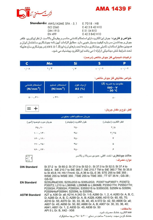 الکترود 1439F محصولی از شرکت صنعتی آما است که با استاندارد جهانی E7018 شناخته میشود. این الکترود دارای روکش قلیایی بوده و از استحکام کششی مناسب و چقرمگی بالایی برخوردار است. ظاهر جوش ایجاد شده توسط این الکترود کیفیت بالایی دارد و سرباره آن بهراحتی جدا میشود.