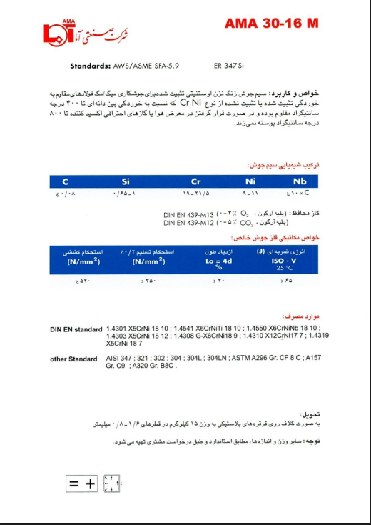 سيم جوش زنگنزن اوستنيتي تثبيت شده براي جوشكاري ميگ/مگ فولادهاي مقاوم به خوردگي تثبيتشده يا تثبيتنشده از نوع CrNi که نسبت به خوردگی بين دانهاي تا 400 درجه سانتيگراد مقاوم بوده و درصورت قرارگرفتن در معرض هوا يا گازهاي احتراقي اكسيدكننده تا 800 درجه سانتيگراد پوسته نميزند.