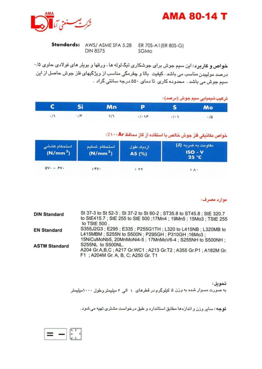 اين سيم جوش براي جوشكاري تيگ لولهها، ورقها و بويلرهاي فولادي حاوي 0.5 درصد موليبدن مناسب ميباشد. كيفيت بالا و چقرمگي مناسب از ويژگيهاي فلز جوش حاصل از اين سيم جوش ميباشد. محدوده كاري آن تا دماي 550 درجه سانتيگراد ميباشد.