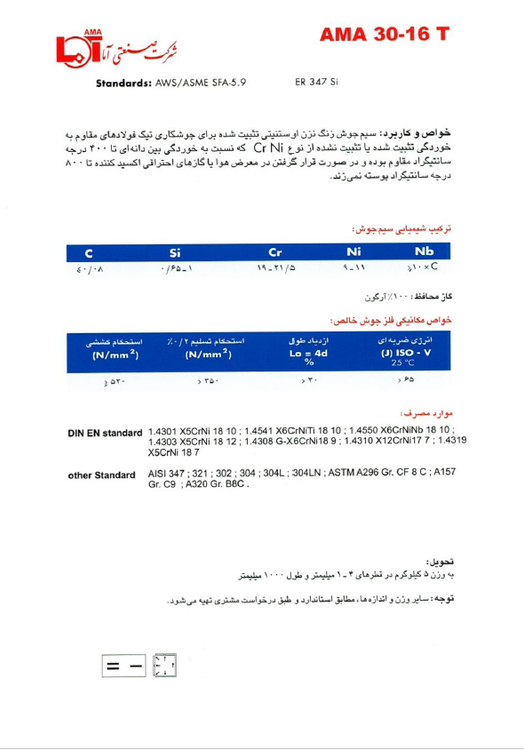 سيم جوش زنگ نزن اوستنيتي تثبيت شده براي جوشكاري تيگ فولادهاي مقاوم به خوردگي تثبيت شده يا تثبيت نشده از نوع Cr Niكه نسبت به خوردگي بين دانهاي تا 400 درجه سانتيگراد مقاوم بوده و درصورت قرار گرفتن در معرض هوا يا گازهاي احتراقي اكسيدكننده تا 800 درجه سانتيگراد پوسته نميزند.