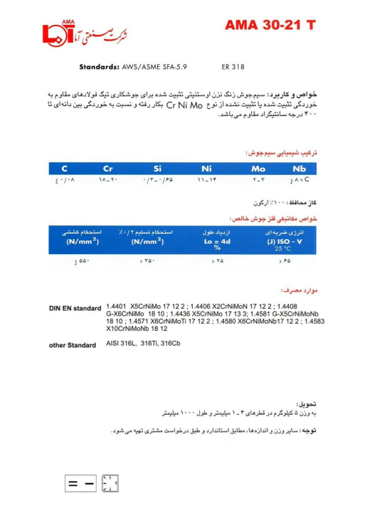 سيم جوش زنگ نزن اوستنيتی تثبيت شده برای جوشكاری تيگ فولادهای مقاوم به خوردگی تثبيت شده يا تثبيت نشده از نوع Cr Ni Mo بكاررفته و نسبت به خوردگي بين دانهای تا 400 درجه سانتيگراد مقاوم می باشد.