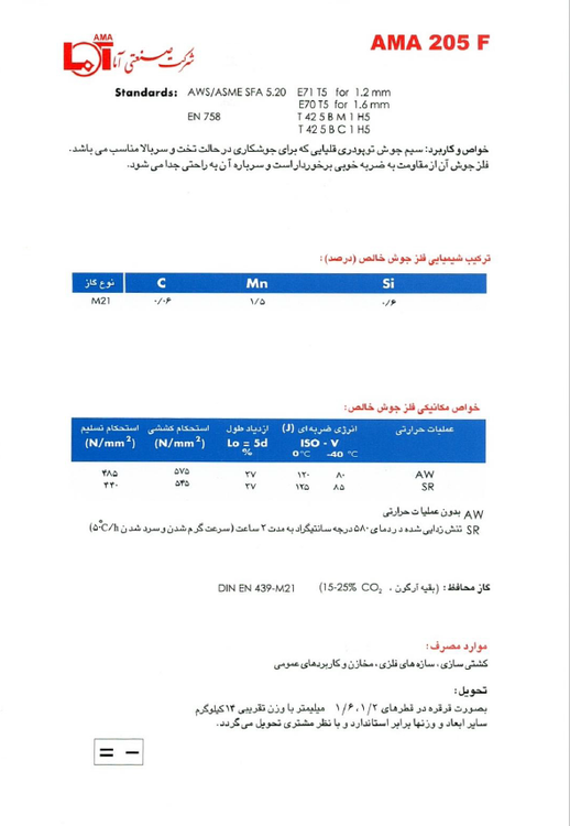 سیم جوش توپودری **205F** یک سیم **فلکس کورد (Flux-Cored)** است که برای جوشکاری **با گاز محافظ (FCAW-G)** استفاده میشود. این سیم معمولاً در جوشکاری **فولادهای کربنی و کمآلیاژ** کاربرد دارد و برای صنایعی مانند **ساختمانسازی، کشتیسازی، لولهکشی و ساخت مخازن فشار** مناسب است.