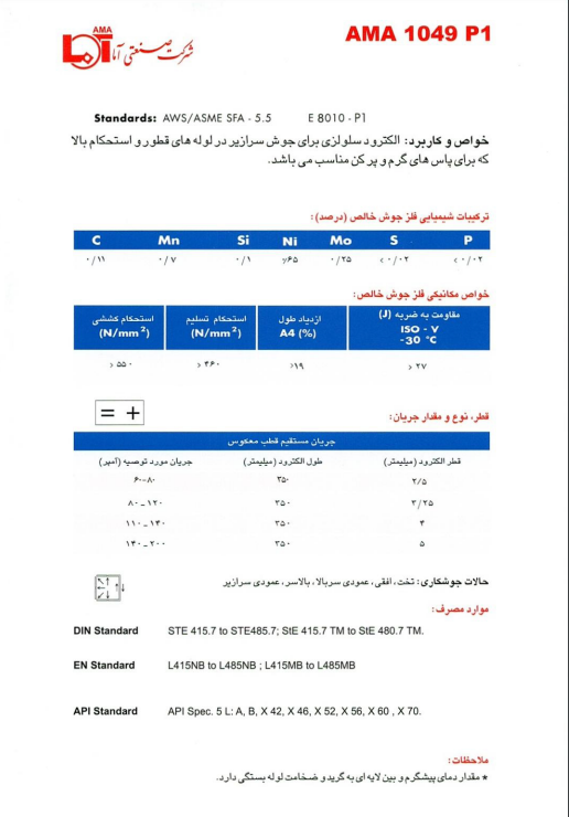 الکترود سلولزي براي جوش سرازير در لولههاي قطور و استحكام بالا كه براي پاسهاي گرم و پركن مناسب ميباشد.