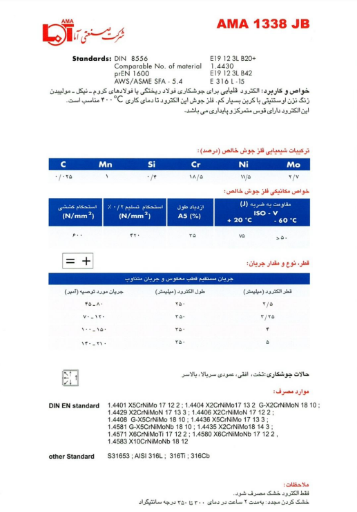 الکترود 1338JB محصول شرکت صنعتی آما، مطابق با استاندارد E 316 L–15 است و دارای پوشش قلیایی میباشد. این الکترود برای جوشکاری فولادهای ریختگی یا فولادهای کروم-نیکل-مولیبدن زنگنزن آستنیتی با کربن بسیار کم مناسب است. فلز جوش این الکترود تا دمای کاری 400 درجه سانتیگراد مناسب میباشد.