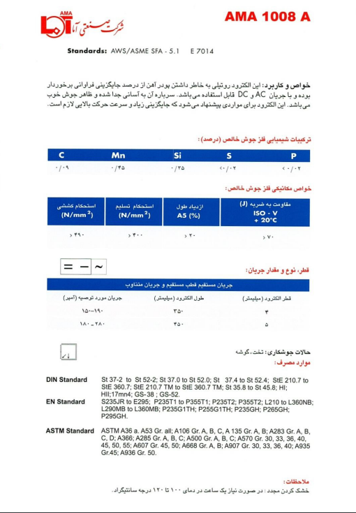 الکترود آما مدل 1008A، بهعنوان یک الکترود روتیلی با پودر آهن، دارای جایگزینی فراوان بوده و با جریانهای AC و DC قابل استفاده است. سرباره آن بهآسانی جدا شده و ظاهر جوش خوبی ایجاد میکند. این الکترود برای مواردی پیشنهاد میشود که جایگزینی زیاد و سرعت حرکت بالایی لازم است.