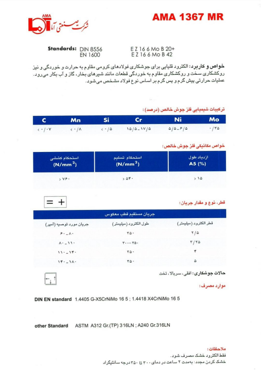 الکترود 1367MR محصولی از شرکت صنعتی آما است که برای جوشکاری فولادهای کرومی مقاوم به حرارت و خوردگی، همچنین برای روکشکاری سخت و مقاوم به خوردگی قطعاتی مانند شیرهای بخار، گاز و آب استفاده میشود.