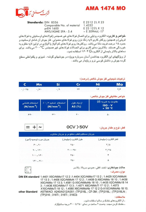 با رعایت این نکات و مشخصات، الکترود AMA 1474Mo میتواند جوشهایی با کیفیت بالا و مقاومت مناسب در برابر خوردگی و حرارت ارائه دهد.