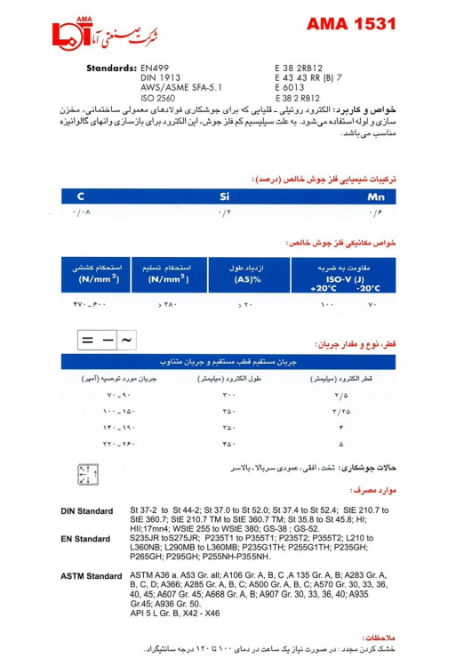 الکترود آما مدل 1531 با کد E6013، یک الکترود روتیلی-قلیایی است که برای جوشکاری فولادهای ساختمانی معمولی، مخزنسازی و لولهها استفاده میشود. به دلیل محتوای سیلیسیم کم در فلز جوش، این الکترود برای بازسازی وانهای گالوانیزه نیز مناسب است.