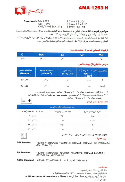 الکترود 1263N از برند آما یک الکترود قلیایی است که برای جوشکاری فولادهای مقاوم به خزش طراحی شده است. این الکترود برای استفاده در مخازن تحت فشار، دیگسازی و لولهکشی تا دمای کاری حدود 570 درجه سانتیگراد مناسب است.