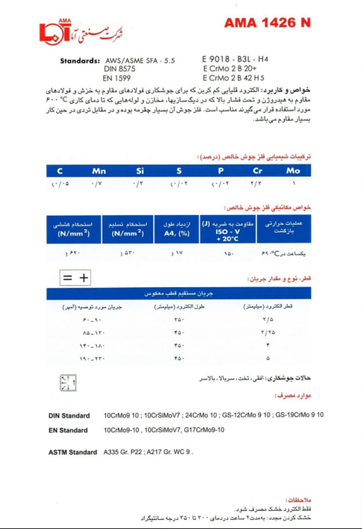 الکترود AMA 1426N یک الکترود قلیایی (بازی) است که بهطور ویژه برای جوشکاری فولادهای مقاوم به حرارت و خزش طراحی شده است. این الکترود، بهویژه برای جوشکاری فولادهای کروم-مولیبدن با 2.25 درصد کروم و 1 درصد مولیبدن استفاده میشود. ترکیب این دو عنصر باعث افزایش مقاومت فولاد در برابر دماهای بالا، فشار شدید و شرایط کاری سخت میشود.